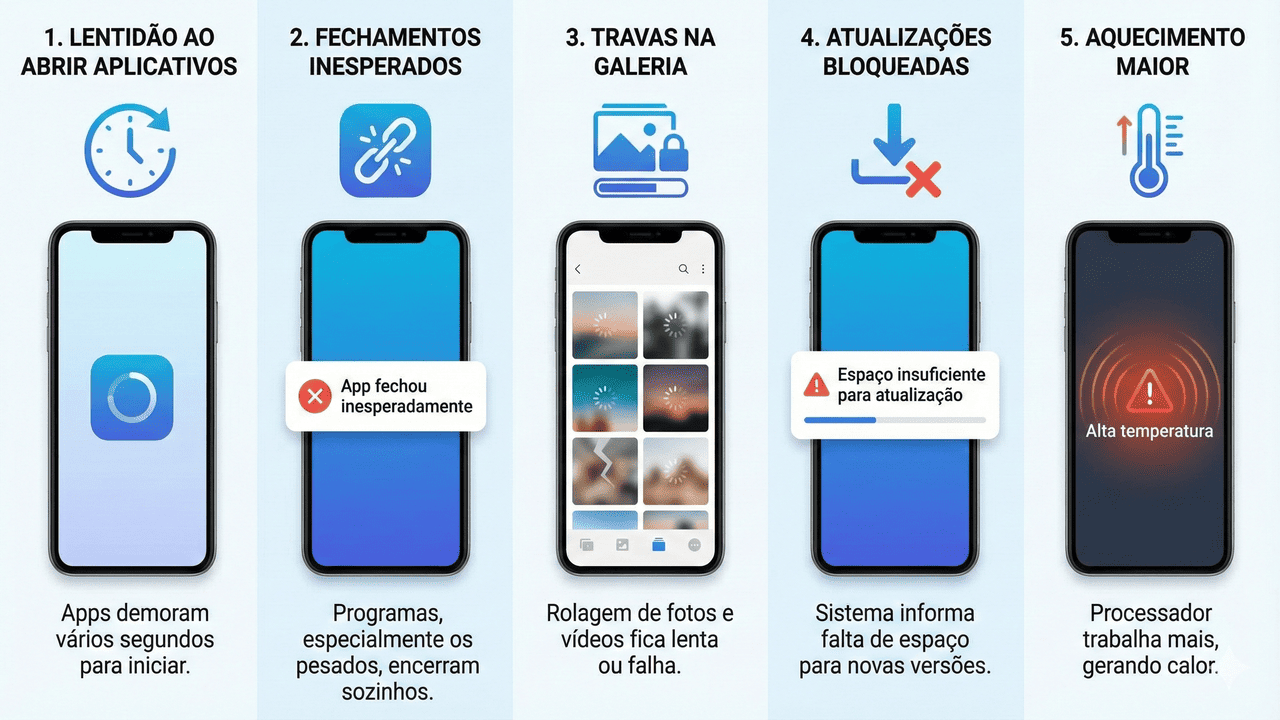 O travamento por armazenamento cheio costuma vir acompanhado de outros sinais claros de alerta. Mensagens de pouco espaço, dificuldade para instalar atualizações, falhas ao tirar fotos e demora para abrir a câmera indicam que o limite está próximo e que o desempenho já está sendo afetado pelo excesso de dados salvos.