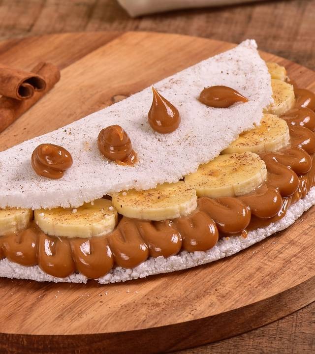 O recheio mais popular nessa preparação é o queijo, que derrete por dentro da massa e cria aquele efeito “puxa-puxa” tão desejado. O contraste entre o doce natural da banana, a textura elástica da tapioca e o toque salgado do queijo lembra uma crepioca recheada ou um sanduíche quente, só que com menos ingredientes.