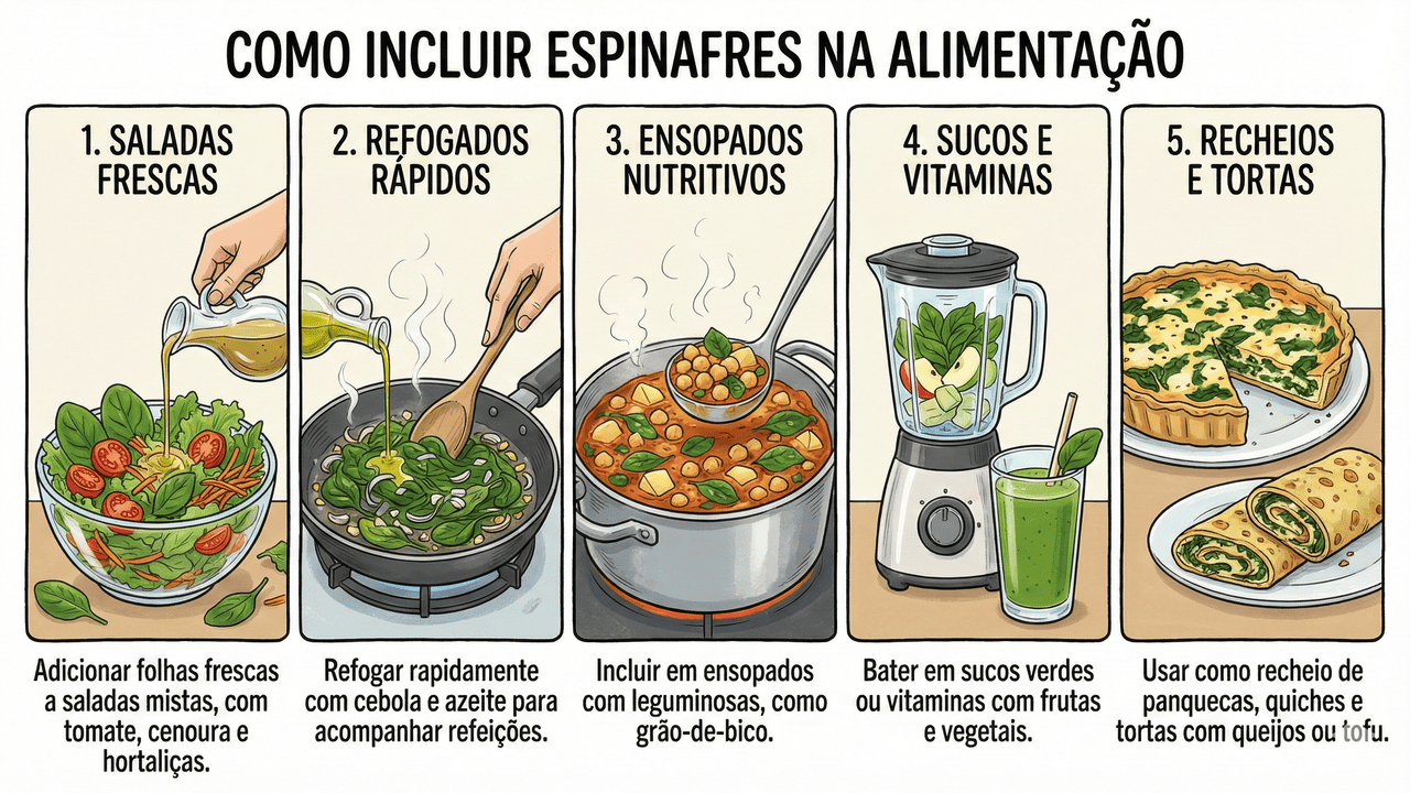 Os espinafres oferecem folatos (vitamina B9), vitamina C, vitamina A e vitamina E, além de compostos antioxidantes, como flavonoides, que se destacam em diretrizes atuais de alimentação saudável.
