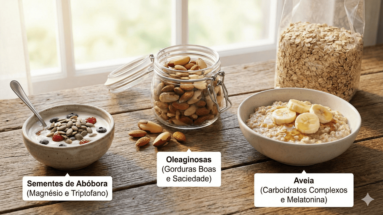 Esses alimentos podem ser usados em combinações simples com frutas, como iogurte com aveia e banana ou um mix de oleaginosas com pedaços de kiwi, sempre em pequenas porções. Abaixo estão alguns exemplos práticos de ingredientes que costumam entrar nessas preparações noturnas: