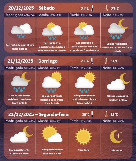 No sábado, há redução da nebulosidade, porém ainda existe previsão de chuva fraca isolada ao longo do dia. As temperaturas seguem estáveis, mantendo sensação de tempo abafado em alguns períodos.