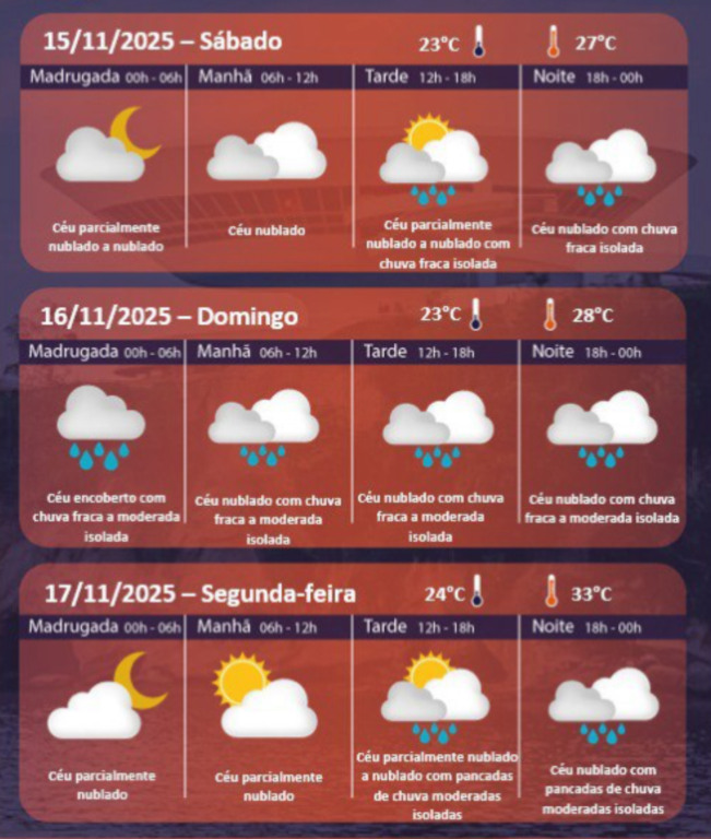 No domingo (16/11), o tempo permanecerá instável em Niterói, com céu predominantemente nublado e previsão de chuva fraca a moderada isolada a qualquer momento. Os ventos estarão fracos a moderados e as temperaturas, estáveis.