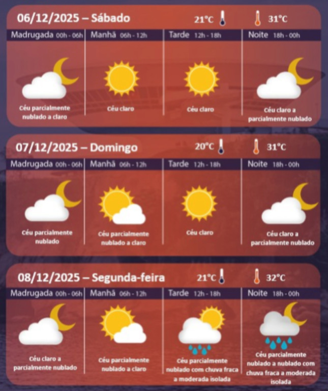 De acordo com o Centro de Monitoramento e Operações da Defesa Civil de Niterói neste sábado (06/12) e no domingo (07/12), um sistema de alta pressão deixará o tempo estável em Niterói, com céu parcialmente nublado a claro, sem previsão de chuva e com ventos predominantemente moderados, principalmente no sábado.