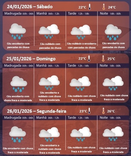 No sábado (24/01), o céu estará nublado a encoberto com previsão de pancadas de chuva moderada a ocasionalmente forte, a qualquer momento. Os ventos serão fracos a moderados e as temperaturas, estáveis.