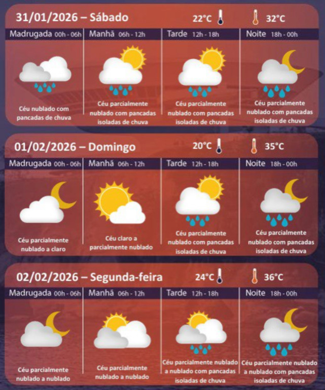 No domingo (01/02), o tempo permanecerá instável, com céu claro a parcialmente nublado e previsão de pancadas isoladas de chuva, a partir da tarde. Os ventos estarão fracos a moderados e as temperaturas, em elevação.