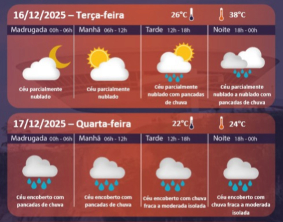 No entanto, há previsão de pancadas de chuva moderada isolada a partir da tarde. Os ventos estarão fracos a moderados, e as temperaturas permanecem estáveis ao longo do dia.
