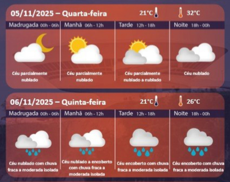 A Defesa Civil recomenda que os moradores fiquem atentos às mudanças bruscas de temperatura e evitem exposição prolongada ao sol nos horários mais quentes desta quarta-feira. Já na quinta, é importante levar guarda-chuva e agasalho leve, pois o clima tende a oscilar ao longo do dia.