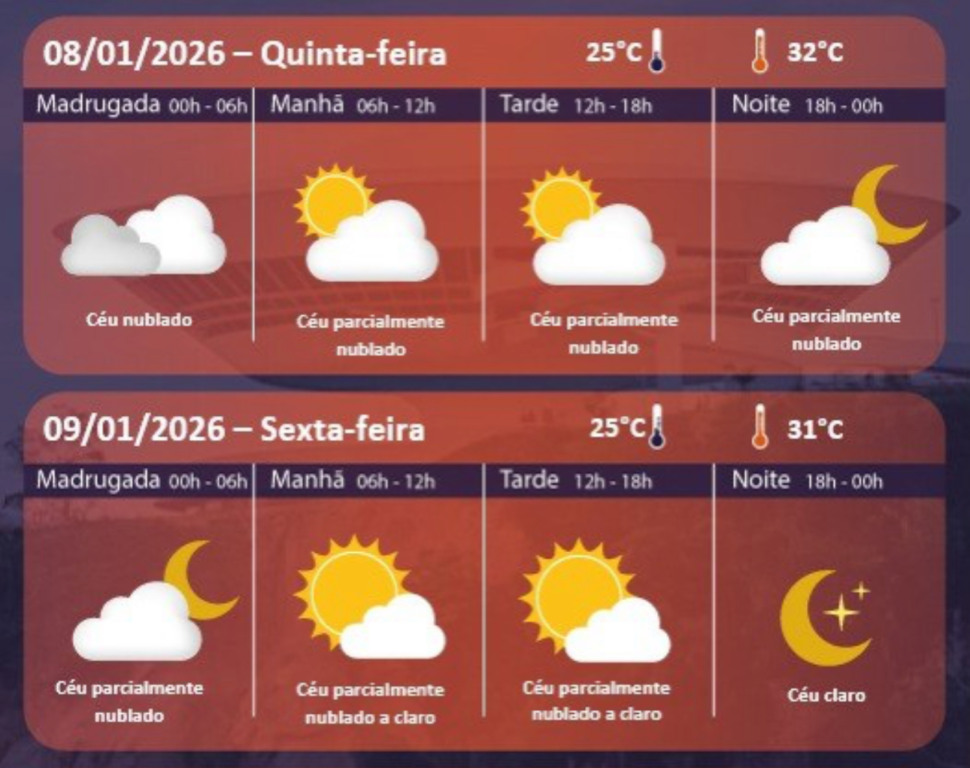 Na sexta-feira (9), a previsão indica redução da nebulosidade, com períodos de sol e tempo estável em todas as regiões da cidade.