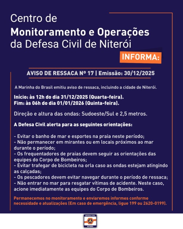 O Centro de Monitoramento e Operações da Defesa Civil de Niterói divulgou, às 14h desta terça-feira (30/12), um AVISO DE RESSACA Nº 17, emitido pela Marinha do Brasil, que inclui o litoral de Niterói justamente no período do Réveillon.