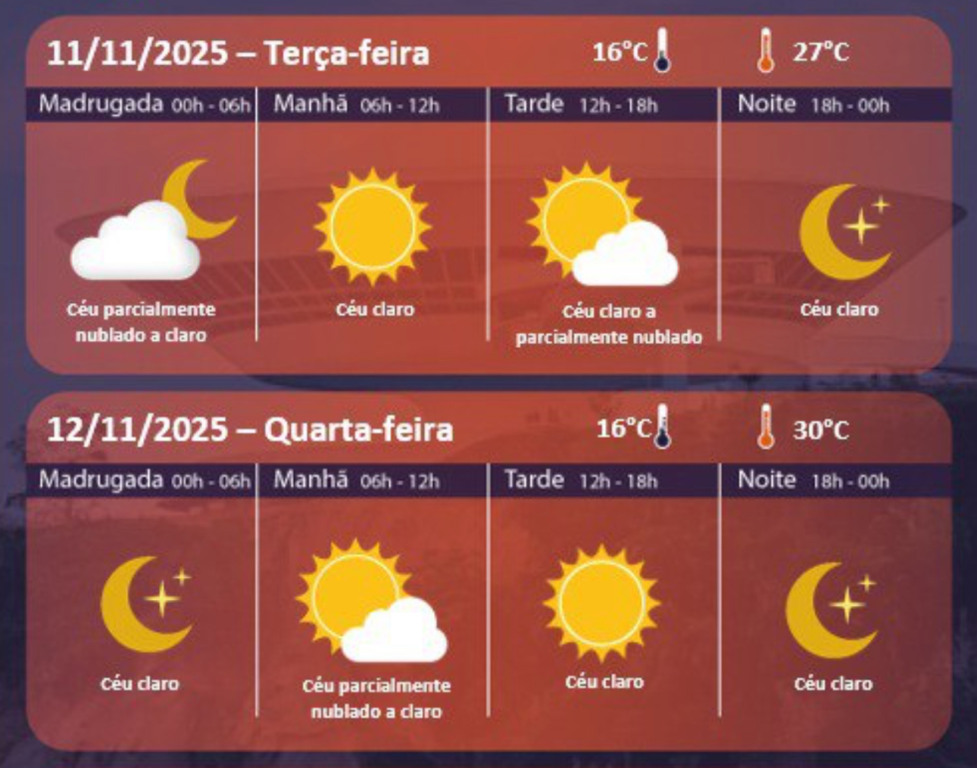 Na quarta-feira (12/11), o tempo permanecerá estável, com céu predominantemente claro e sem previsão de chuva. Os ventos estarão moderados e as temperaturas, em elevação.