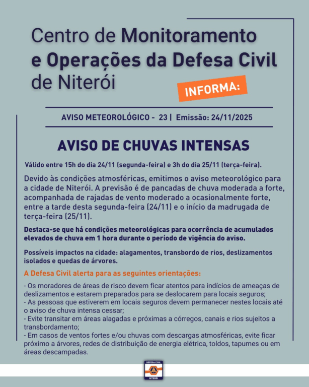 Devido às condições atmosféricas, emitimos o aviso meteorológico para a cidade de Niterói. A previsão é de pancadas de chuva moderada a forte, acompanhada de rajadas de vento moderado a ocasionalmente forte, entre a tarde desta segunda-feira (24/11) e o início da madrugada de terça-feira (25/11).