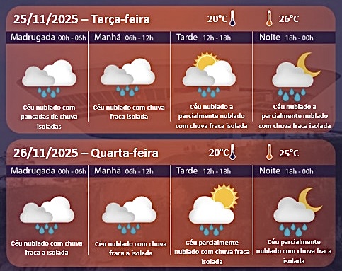Na quarta-feira (26/11), ventos úmidos do oceano manterão o tempo instável, com céu nublado a parcialmente nublado e previsão de chuva fraca isolada a qualquer momento. Os ventos estarão fracos a moderados.