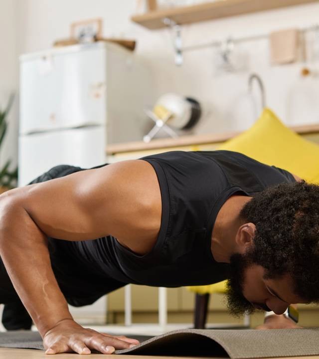 - Flexão de braços para fortalecer o peitoral e os braços em variados graus de dificuldade;