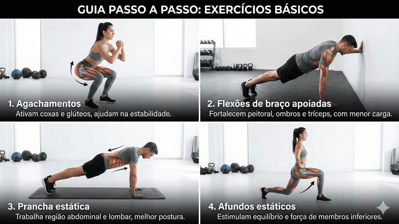 O foco é trabalhar pernas, tronco e braços, além de incluir algum estímulo cardiorrespiratório leve. Um exemplo de circuito funcional que ocupa pouco espaço inclui movimentos básicos, que podem ser feitos em piso firme ou sobre um tapete ou toalha: