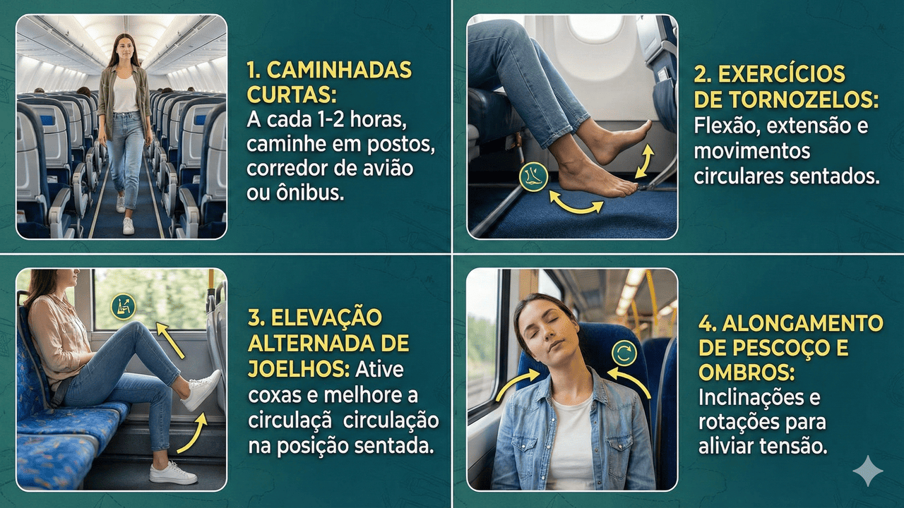 Algumas estratégias simples de movimento durante a viagem podem ser feitas de forma discreta, sem atrapalhar outros passageiros. A ideia é ativar articulações e musculatura com frequência, mesmo quando não é possível se levantar por muito tempo.