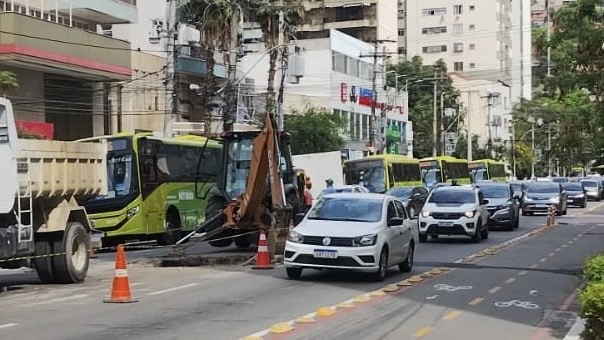 De acordo com a concessionária, o serviço precisou ser executado com caráter de urgência após o rompimento de uma rede coletora de esgoto. A faixa central da via, no sentido Centro, foi interditada, provocando retenções significativas desde as primeiras horas da manhã.