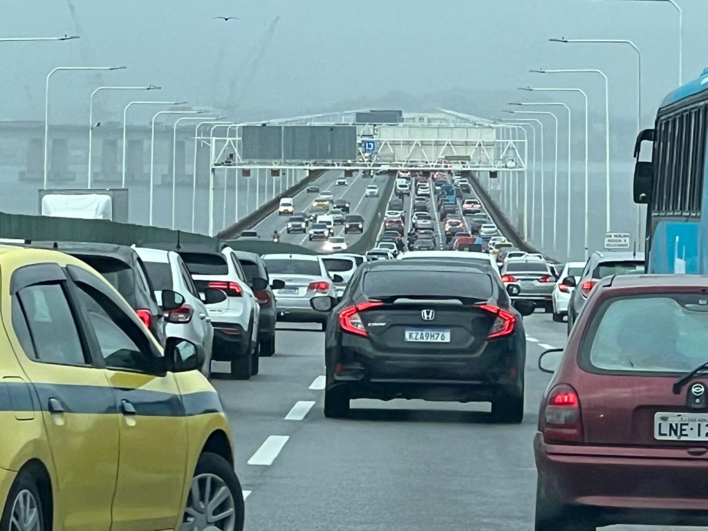 Às 7h, o tempo de travessia no sentido Rio de Janeiro já chegava a 40 minutos, com lentidão desde a descida do Vão Central até a Reta do Cais.