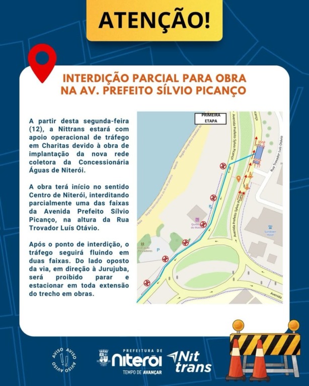 Nesta fase inicial, a obra terá início no sentido Centro de Niterói, com interdição parcial de uma das faixas da Avenida Prefeito Sílvio Picanço, na altura da Rua Trocador Luís Otávio.