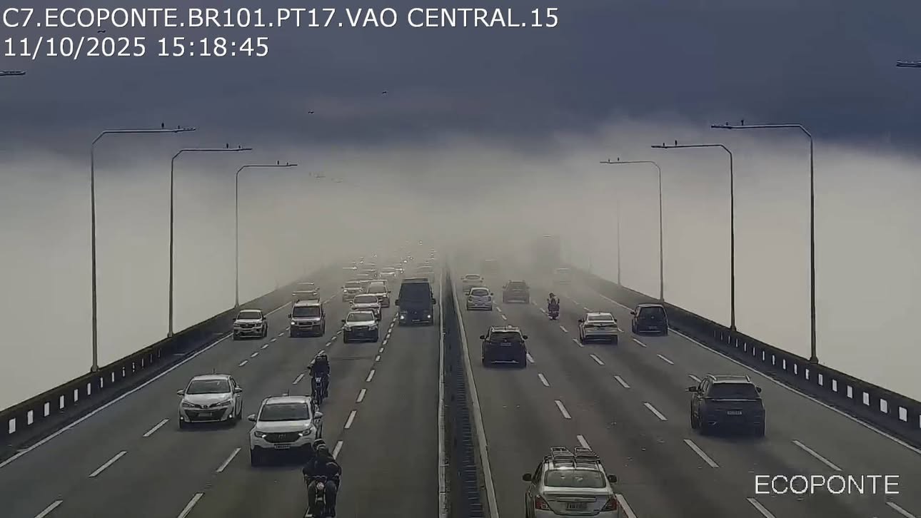 Um forte nevoeiro cobriu a Ponte Rio-Niterói na tarde deste sábado (11), chamando a atenção de quem observava a paisagem tanto do Rio de Janeiro quanto de Niterói.